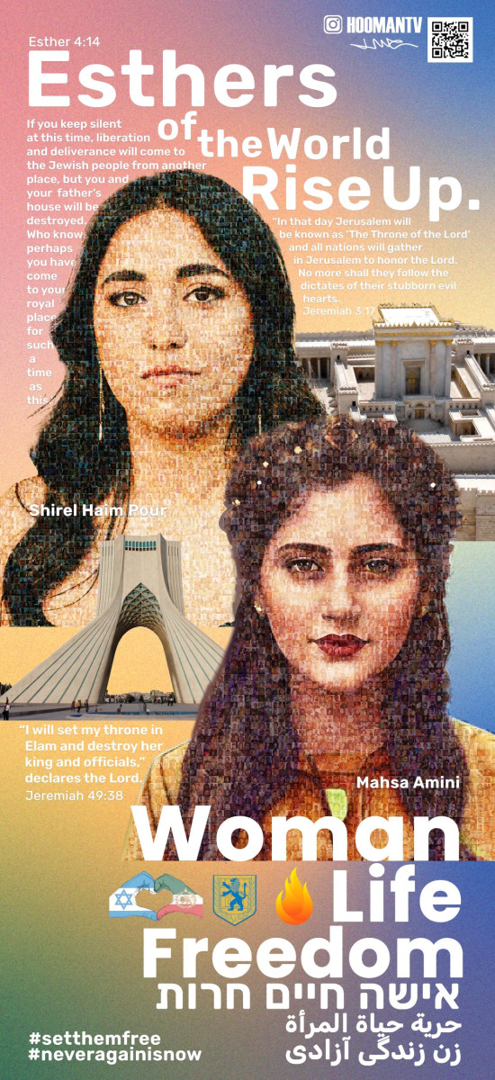 This mural, unveiled in Washington, D.C., stands as a bridge between two peoples and two struggles — the Jewish people and the Iranian people — both bound by a longing for freedom and dignity. It features Mahsa Amini, whose death in Iranian custody sparked the Woman Life Freedom revolution, alongside Shirel Haim Pour, a young Persian-Israeli woman murdered by Hamas. Their portraits, composed of thousands of faces of women around the world, form a living mosaic of shared courage and sorrow.